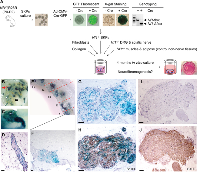 Figure 4: Three-dimensional skin raft culture system for neurofibroma formation in vitro. Nf1-/- SKPs were co-cultured with Nf1+/- DRGs, sciatic nerves, adipose and muscle tissues in an in vitro raft culture A. Rafts were harvested 4 months after setup for X-gal staining to trace the SKPs that are clustered within nerve tissues (red arrow) but not in muscle/adipose tissues (black arrow), indicating SKPs are neurotropic B. A DRG infiltrated by SKPs C. Histological analysis revealed that SKPs incorporated into nerve tissue D. Many areas within the in vitro raft culture show hyperplasia of LacZ-positive disorganized cells with wavy nuclei E-G. and these areas are positively stained with Schwann cell marker S100 H. In control experiments, nerve tissue did not show any sign of neoplasm I-J. Scale bar = 50 μm.