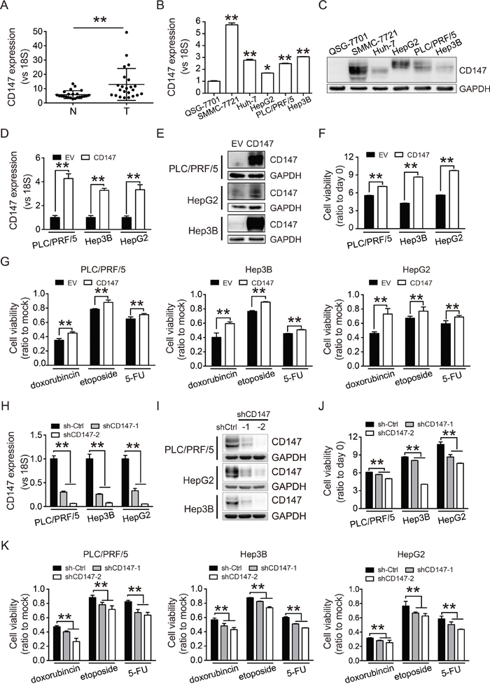 To investigate the effects of CD147 on HCC cell proliferation, we overexpressed CD147 in PLC/PRF/5, Hep3B, and HepG2 cells using a lentiviral infection strategy. Cells that stably overexpressed CD147 were selected with puromycin (Figure 1D and 1E). Overexpression of CD147 promoted cell proliferation (Figure 1F) and conferred resistance to cytotoxic chemotherapy (Figure 1G). We next knocked down CD147 using lentivirus-mediated shRNA (Figure 1H and 1I). Knockdown of CD147 inhibited cell growth (Figure 1J) and sensitized the cells to chemotherapy (Figure 1K). These results demonstrated that CD147 enhanced cell proliferation and protected cells from the effects of chemotherapy, suggesting that it might be an attractive therapeutic target in HCC.