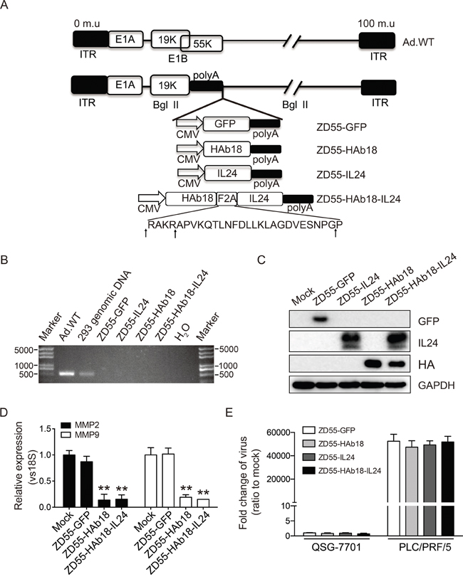 Figure 2: Construction and characterization of the oncolytic adenoviruses. A. Schematic of the structures of the oncolytic adenoviruses. The amino acid sequence of F2A is shown. Arrows indicate the cleavage sites in F2A. Ad.WT, wild-type adenovirus. ITR, inverted terminal repeat. B. Characterization of oncolytic adenoviruses by PCR using the E1B-55KD forward and reverse primers (Supplementary Table S1). All oncolytic adenovirus showed no wild-type contamination. C. Western blot detection of genes carried by ZD55 in PLC/PRF/5 cells 48 hours after oncolytic adenovirus infection (10 MOI). GAPDH was used as a loading control. D. Analysis of MMP-2 and MMP-9 in PLC/PRF/5 cells treated with the indicated oncolytic adenoviruses (MOI of 10) for 48 hours by qRT-PCR. E. Analysis of the replication ability of the oncolytic adenoviruses in normal hepatocytes (QSG-7701) and tumor cells (PLC/PRF/5) by qRT-PCR. The adenovirus E1A region was amplified to evaluate viral replication 48 hours after infection (MOI of 10). The qRT-PCR data in (D) and (E) were normalized to 18S, and are shown as the fold change relative to mock cells. All experiments were repeated three times. The bars represented the mean ± S.D. (n = 3). **p < 0.01.