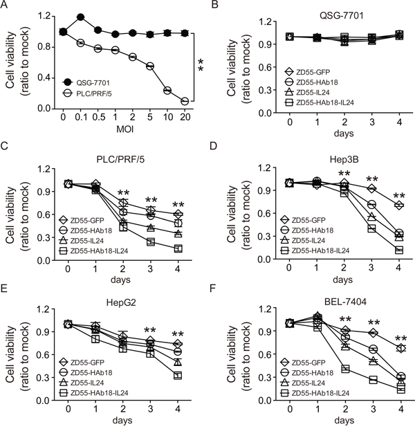Figure 3: ZD55-HAb18-IL24 displays antitumor activity in vitro. A. The viability of PLC/PRF/5 and QSG-7701 cells infected with ZD55-HAb18-IL24 at the indicated MOIs on day 4. B-F. The viability of QSG-7701, PLC/PRF/5, Hep3B, HepG2, and BEL-7404 cells infected with the indicated oncolytic adenoviruses for 4 days at an MOI of 10. Cell viability was assessed using CCK-8 assays. All experiments were repeated three times. The bars represent the mean ± S.D. (n = 3), *p < 0.05, **p < 0.01.