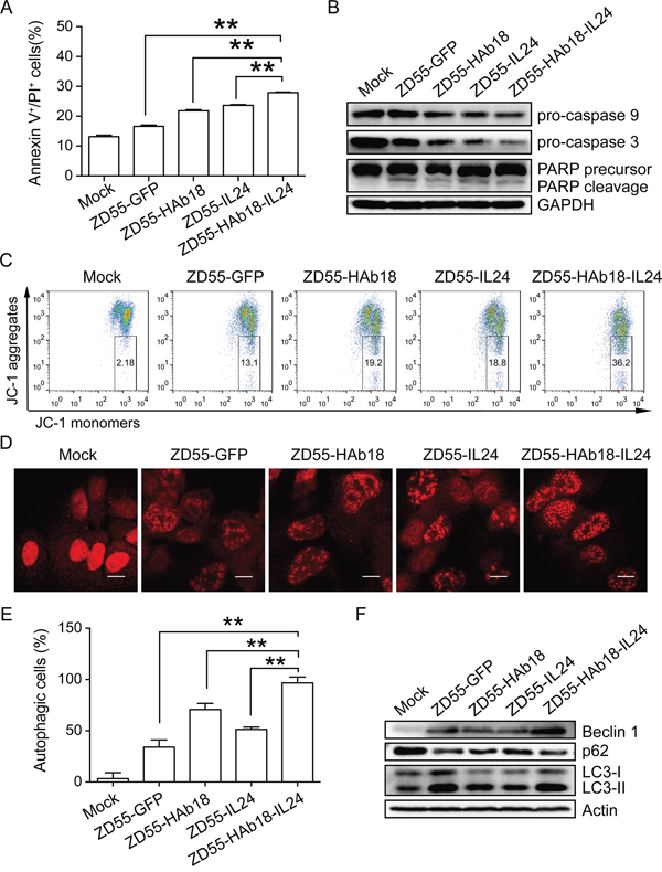 Figure 4: ZD55-HAb18-IL24 induces apoptosis and autophagy in PLC/PRF/5 cells. A. Apoptosis was evaluated in oncolytic adenovirus-infected PLC/PRF/5 cells using Annexin V/PI staining. B. Western blot detection of procaspase-9, procaspase-3, and PARP in PLC/PRF/5 cells. GAPDH was used as a loading control. C. Oncolytic adenoviruses alter the mitochondrial membrane potential (Δψm) in PLC/PRF/5 cells. The numbers in the quadrilateral region show the ratio of cells with altered Δψm. D. Representative images of LC3 puncta in PLC/PRF/5 cells infected with indicated oncolytic adenoviruses. Scale bars, 10 μm. E. Statistical data for the three repeats in (D). F. Western blot detection of beclin-1, p62, and LC3-I/II in oncolytic adenovirus-infected PLC/PRF/5 cells. Actin was used as a loading control. PLC/PRF/5 cells were infected with the indicated oncolytic adenoviruses (MOI of 10) for 2 days. All experiments were repeated three times. The bars represent the mean ± S.D. (n = 3). **p < 0.01.
