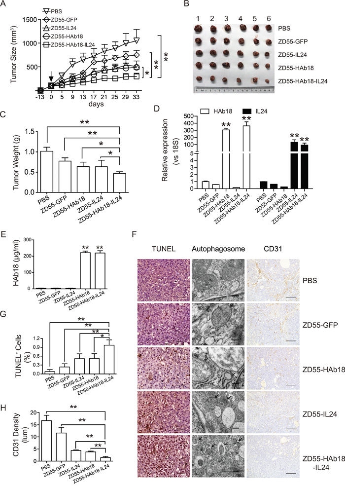 Figure 5: ZD55-HAb18-IL24 displays antitumor activity in vivo. A. Growth curve of PLC/PRF/5 xenograft tumors after intratumoral injection of the indicated adenoviruses. Oncolytic adenoviruses were injected 13 days after subcutaneous inoculation of PLC/PRF/5 cells (day 0, arrow). The corresponding volumes of PBS were injected as a control. B, C. Tumors were excised, weighed, and photographed 33 days after injection. Significant decreases in tumor volume (B) and weight (C) were observed in the ZD55-HAb18-IL24-treated group. The bars represent the mean ± S.D. (n = 6). D. qRT-PCR detection of HAb18 and IL24 expression in tumors from each group. Data were normalized to 18S, and are shown as the fold change relative to PBS-treated cells. E. ELISA detection of HAb18 concentration in serum 33 days after virus injection. F. Representative images of TUNEL staining (scale bar, 100 μm; left panel), electron microscopy (scale bar, 200 nm; middle panel), and CD31 immunohistochemical staining (scale bar, 100 μm; right panel) of tumor sections from each group. G. Quantification of the TUNEL staining results in (F). H. Quantification of CD31-positive cells in (F). The bars represent the mean ± S.D. of triplicate samples. *p < 0.05, **p < 0.01.