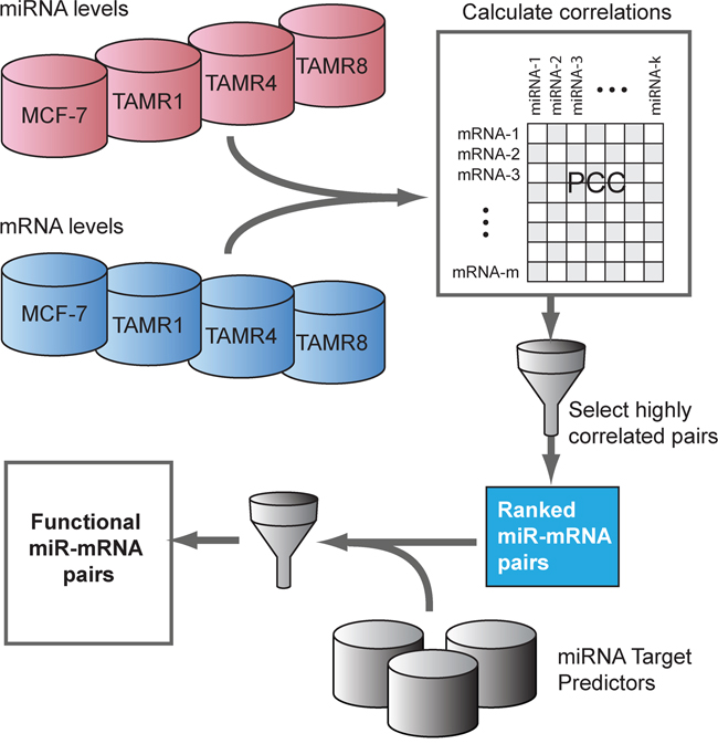 Our systematic approach of inferring miRNA-target relationships elucidated important and detailed gene regulation events that may contribute to the development of tamoxifen resistance. Several miRNA-target relationships were identified, many showing significant association with various signaling events previously associated with the development of tamoxifen resistance. Clearly further functional studies are needed to experimentally confirm the identified miRNA-target relationships. While we realize that the observed gene regulation is a combination of miRNA targeting as well as post-transcriptional modifications of the upstream promoters of miRNAs and/or their target genes, our study nonetheless supports the importance of miRNA-mediated gene regulatory events in tamoxifen resistance. Targeted experiments based on our findings will bring insight into tamoxifen resistance in ER+ breast cancer and provide the basis for future medical intervention of ER+ tamoxifen-resistant breast cancer.