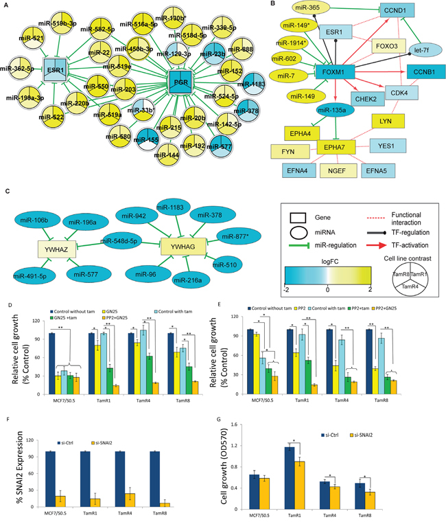 We found that more than 60% of the significantly differentially-expressed genes showed a coherent inverse correlation of expression to their putative miRNA regulators (Supplementary Table 7). In addition, combinatorial regulation by miRNA, where more than one miRNA targets the 3’ UTR of mRNAs, may lead to a stable attenuation of expression of target mRNAs [23]. As an example of combinatorial regulation by miRNA is 14-3-3γ (YWHAG), which frequent overexpression is predictive of poor patient outcome in tamoxifen-resistant breast cancer and functions by activation of the MAPK and PIK pathways [24, 25]. We observed that YWHAG and YWHAZ were upregulated in TamR8, but not in TamR1 or TamR4. Their putative miRNA regulators were significantly downregulated in TamR8 (p ≤ 0.05). Bergamaschi et al. [24] recently showed that tamoxifen plays a suppressive role on expression of miR-451 in TamR cell lines by inducing loss-of-regulation of YWHAZ due to downregulation of miR-451, its known regulatory miRNA. However, we found no significant over-expression of miR-451 in our study.
