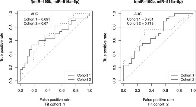 Figure 5: ROC curve analysis to assess the ability of miRNAs to predict outcome of cohorts of ER+ breast cancer patients receiving tamoxifen monotherapy. Selected miRNAs that exhibited altered expression in TamRs vs. MCF-7/S0.5 cell lines were also predictive of recurrence following tamoxifen treatment. The 2-miR classifier, miR-190b and miR-516a-5p, was fit on cohorts 1 and 2 (Fit cohort) and then applied to both cohorts independently. Training performance is observed when Fit cohort and test cohorts are the same (dotted lines), while independent test set performance is observed when they differ (solid lines).