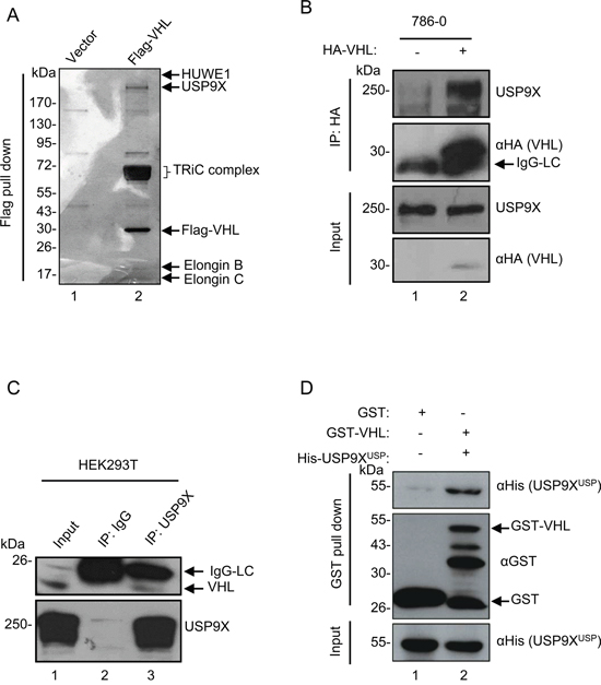 Figure 1: USP9X physically interacts with pVHL. A. In vivo Flag pull-down analysis. Empty or Flag-pVHL vector was transfected into HEK293T cells for 24 hours. Harvested cells were subjected to Flag pull-down assay. Samples were run on a gradient gel followed by silver staining. Indicated bands were excised for MS analysis. B. In vivo binding of pVHL with USP9X. 786-0 cells infected with HA empty control or HA-VHL were treated with MG132 (10 μM) for 4 hours. Cells were harvested and then immunoprecipitated with anti-HA antibody followed by immunoblotting with anti-USP9X and anti-HA antibodies. C. In vivo binding of endogenous pVHL with USP9X. HEK293T cells treated with MG132 (10 μM for 4 hours) were immunoprecipitated with an anti-USP9X antibody and immunoblotted with indicated antibodies. The indicated pVHL is the shorter isoform of endogenous pVHL – pVHL19. D. In vitro binding of pVHL with the USP9X USP domain. GST control or GST-tagged pVHL was incubated with His-tagged USP9XUSP (USP9X USP domain).