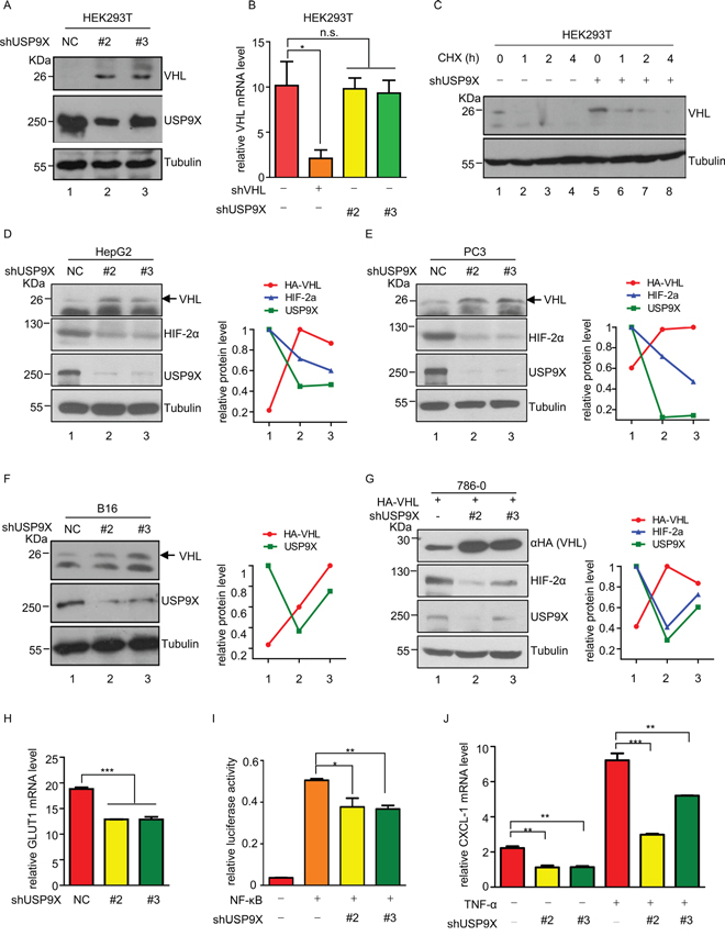 Figure 2: USP9X negatively regulates pVHL. A. Western blot analysis of pVHL protein levels in USP9X knockdown cells. HEK293T cells were infected with scramble or shUSP9X lentivirus for 48 hours. After harvesting cells were immunoblotted with indicated antibodies. B. Relative VHL mRNA levels in USP9X knockdown cells. Either VHL or USP9X was knocked down in HEK293T cells and mRNA levels of VHL were determined by qPCR. The expression levels are normalized to the GAPDH mRNA level. The results represent the mean ± SEM of three independent experiments and were analyzed with the Student’s t-test. * p < 0.05; n.s. p ≥ 0.05. C. Half-life of pVHL was measured by immunoblotting in USP9X knockdown cells. HEK293T cells were infected with scramble or shUSP9X lentivirus and treated with cycloheximide (100 μg/ml) for the indicated times. D-F. Western blot analysis in different USP9X knockdown cell lines. HepG2, PC3 and B16 were infected with scramble or USP9X shRNA lentivirus for 48 hours, harvested and then immunoblotted with indicated antibodies. Quantification of indicated protein levels relative to β-tubulin is shown. G. Western blot analysis of exogenous VHL protein levels in USP9X knockdown cells. 786-0 cells expressing HA empty control or HA-VHL were infected with scramble or shUSP9X lentivirus for 48 hours and subjected to western blot followed by immunoblotting with indicated antibodies. Indicated protein levels were quantified relative to β-tubulin as shown. H. Relative GLUT1 mRNA levels were evaluated by qPCR in HEK293T cells infected with scramble or shUSP9X lentivirus. Expression levels are normalized to the GAPDH mRNA level. The results represent the mean ± SEM of three independent experiments and were analyzed with the Student’s t-test. *** p < 0.001. I. NF-κB activity was assessed after USP9X reduction. pGL3-NF-κB and renilla plasmids were co-transfected into HEK293T cells or USP9X knockdown HEK293T cells. Cells were harvested after 24 hours and lysed to evaluate fluorescence values. The results represent the mean ± SEM of three independent experiments and were analyzed with the Student’s t-test. ** p < 0.01; * p < 0.05. J. Relative mRNA levels of NF-κB downstream genes were evaluated after USP9X reduction. qPCR was used to evaluate the NF-κB downstream target gene CXCL-1 in indicated HEK293T cells. Expression levels were normalized to the GAPDH mRNA level. The results represent the mean ± SEM of three independent experiments and were analyzed with the Student’s t-test. *** p < 0.001; ** p < 0.01.