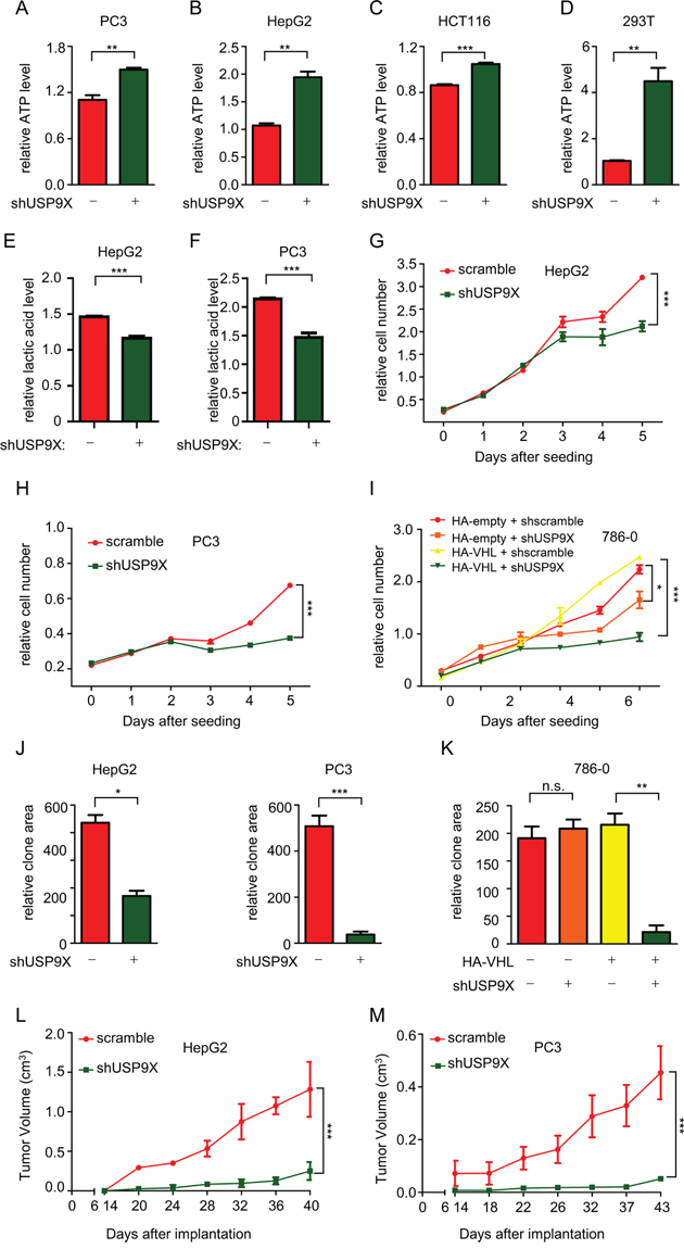 Figure 3: USP9X promotes tumor cell proliferation through the pVHL-HIF pathway. A-D. ATP levels were measured after knockdown of USP9X in different cell lines. 1 × 104 cells as indicated were used to evaluate ATP levels. The results represent the mean ± SEM of three independent experiments and were analyzed by the Student’s t-test. *** p < 0.001;** p < 0.01. E. and F. Lactic acid levels were assessed after USP9X reduction in HepG2 and PC3 cells. 1× 103 cells as indicated were placed in a 96-well plate and cultured for 48 hours before the measurement of lactic acid. The results represent the mean ± SEM of three independent experiments and were analyzed with the Student’s t-test. *** p < 0.001. G-I. Cell proliferation assays were performed in different USP9X knockdown cell lines. 5 × 102 cells as indicated were placed in a 96-well plate and cultured for the indicated number of days. Relative cell numbers were quantified each day. The results represent the mean ± SEM of three independent experiments and were analyzed with two-way ANOVA. *** p < 0.001; *p < 0.05. J. and K. Quantification of clones in colony formation assays performed in different USP9X knockdown cell lines. Cells as indicated were plated in 6-well plates at 1× 103 cells per well, and were fixed and stained with crystal violet after culture for 14 days. The results represent the mean ± SEM of three independent experiments and were analyzed with the Student’s t-test. *** p < 0.001; ** p < 0.01; *p < 0.05; n.s. p ≥ 0.05 L. and M. Tumor growth in nude mice after USP9X reduction. Indicated HepG2 and PC3 cells were injected into nude mice. Tumor volume was measured at indicated days after injection. The results represent the mean ± SEM of three independent experiments and were analyzed with two-way ANOVA. *** p < 0.001.