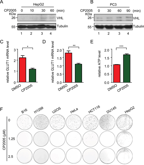 Our findings show pVHL is induced by USP9X knockdown, raising the possibility a suitable USP9X inhibitor may exert a similar effect. We tested CP2005 which is a known effective USP9X inhibitor [63]. CP2005 treatment of HepG2 and PC3 cells significantly up-regulated endogenous levels of pVHL (Figure 4A and 4B, lane 1 versus lanes 2-4) and down-regulated HIF activity, as determined by GLUT1 mRNA levels (Figure 4C and 4D). The ATP level in HepG2 cells was also induced by CP2005, reflecting the capacity of CP2005 for restricting tumor cell metabolism (Figure 4E). CP2005 also demonstrated an inhibitory effect on cancer cell growth. Cancer cell lines including renal cell carcinoma (CAKI), lung carcinoma (H1299), prostate carcinoma (DU145), human cervical carcinoma (Hela), human colon carcinoma (HCT116), mouse melanoma carcinoma (B16), and liver carcinoma (HepG2) were used to assess clone transformation after CP2005 treatment. Marked growth inhibition resulted from CP2005 treatment in various cancer cell lines (Figure 4F). These results show that CP2005 can be used to induce pVHL, and further inhibit tumor cell growth.