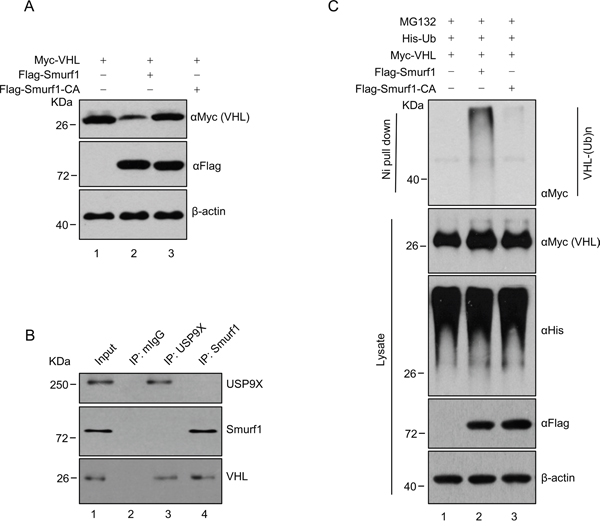 Figure 5: USP9X down-regulates pVHL through Smurf1. A. HEK293T cells were transfected with constructs as indicated and harvested after 36 hours. Harvested cells were immunoblotted with indicated antibodies. B. CAKI cell lysates were subject to immunoprecipitation with anti-USP9X or Smurf1 antibodies. Immunoprecipitates were then blotted. C. HEK293T cells transfected with the indicated constructs were treated with MG132 (10 μM) for 8 h before harvest. Cell lysate was subjected to pulldown with Ni-NTA beads and western blot with anti-Flag antibody to evaluate for ubiquitinylated pVHL.