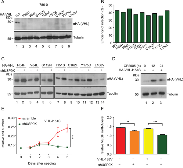 Figure 6: Newly identified unstable pVHL mutants maintain partial pVHL function and are negatively regulated by USP9X. A. and B. Western blot analysis (A) and infection efficiency (B) of wild-type and mutant pVHL 786-0 cells. 786-0 cells were infected with VHL virus as indicated for 48 hours. Cells were harvested and immunoblotted with indicated antibodies. The infection efficiency of infected 786-0 cells was evaluated by flow cytometry. C. Western blot analysis of wild-type or mutant pVHL protein levels after USP9X reduction. 786-0 cells as indicated were infected with scramble or shUSP9X lentivirus for 48 hours. Protein levels as indicated were evaluated with western blot. D. Western blot analysis of pVHL protein levels in 786-0-HA-I151S cells under CP2005 treatment. 786-0-HA-I151S cells were treated with CP2005 (1.25 μM) for indicated periods of time. E. 786-0-mock and 786-0-HA-I151S cell lines were infected with scramble or shUSP9X lentivirus for 48 hours. 5 × 102 cells as indicated were placed in a 96-well plates and cultured for the indicated number of days. Relative cell numbers were quantified each day. The results represent the mean ± SEM of three independent experiments and were analyzed with two-way ANOVA. *** p < 0.001. F. Relative VEGF mRNA expression levels were determined by qPCR in 786-0-mock and 786-0-HA-L188V cell lines infected with scramble or shUSP9X lentivirus. Expression levels are normalized to the GAPDH mRNA level. The results represent the mean ± SEM of three independent experiments and were analyzed with the Student’s t-test. *** p < 0.001; ** p < 0.05.