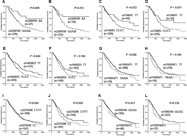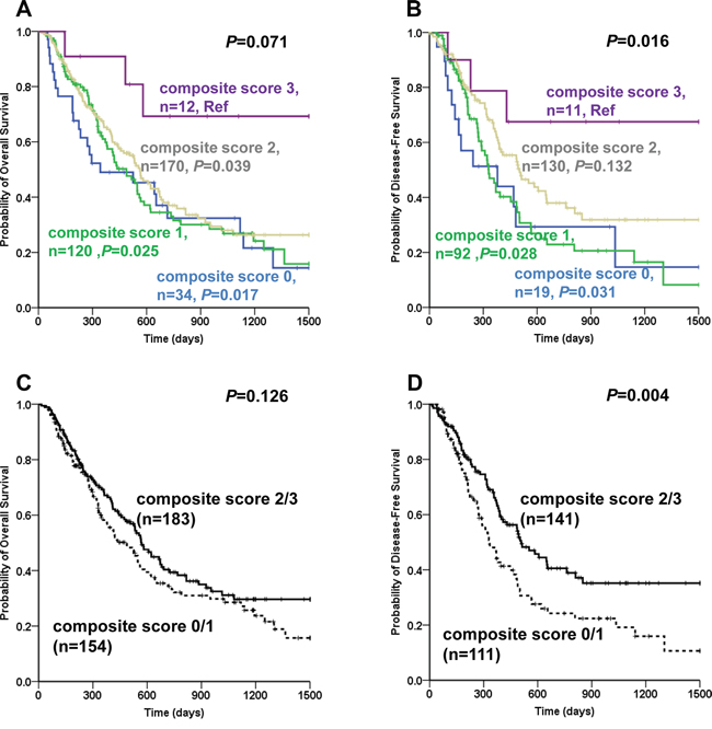 A DNMT3A combined genotype score model was created by figuring up the genotyped data of multi-SNPs. Score 1 indicated favorable genotype(s) (i.e. rs11695471 TT genotype, or rs734693 CC genotype, or rs2276598 CT/TT genotype for chemosensitivity; rs2289195 AA genotype, or rs11695471 TT genotype, or rs2276598 CT/TT genotype for prognosis) and score 0 indicated unfavorable genotype(s) (i.e. rs11695471 TA/AA genotype, or rs734693 CT/TT genotype, or rs2276598 CC genotype for chemosensitivity; rs2289195 GG/GA genotype, or rs11695471 TA/AA genotype, or rs2276598 CC genotype for prognosis). After adding up the score of every SNP, four score groups were generated: composite score 0, composite score 1, composite score 2 and composite score 3. And then another two chemosensitivity groups were defined: the relatively unfavorable response group (composite score 0) and the relatively favorable response group (including composite score 1, composite score 2 and composite score 3). Two prognosis groups were also defined: the relatively unfavorable prognosis group (including composite score 0 and composite score 1) and the relatively favorable prognosis group (including composite score 2 and composite score 3).