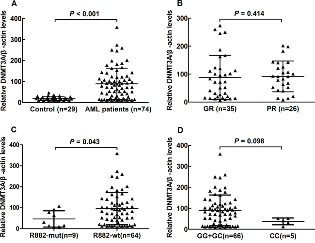 We unbiasedly selected 74 cases’ bone marrow (BM) or peripheral blood mononuclear cells (PBMCs) from this cohort, whose baseline characteristics were shown in Supplementary Table S3. DNMT3A mRNA expression was also assessed by RT-qPCR and compared with 29 normal peripheral blood samples obtained from healthy donors who had no prior history of malignancy. Mononuclear cells were separated by centrifuging (400 × g) and layering for 30 minutes at 18°C~25°C mixing equal volume of Histopaque-1077 (Sigma–Aldrich, St. Louis, MO). Total RNA was purified with RNAiso Plus reagents (Takara-Bio, Dalian, China) and stored at −80 °C until analysis. The cDNA was reverse transcribed using Prime Script™ RT reagent kit (Takara-Bio, Dalian, China). QRT-PCR was performed on a LC480® real-time PCR system (Roche, USA) using the real-time PCR quant kit (Takara, Biotechnology, Dalian, China). The forward primer of DNMT3A was 5’-AGTAC GACGACGA CGGCTA-3’, the reverse primer was 5’-CACACTCCACGCAAAAGCAC-3’. The β-actin mRNA expression was used as an endogenous control.