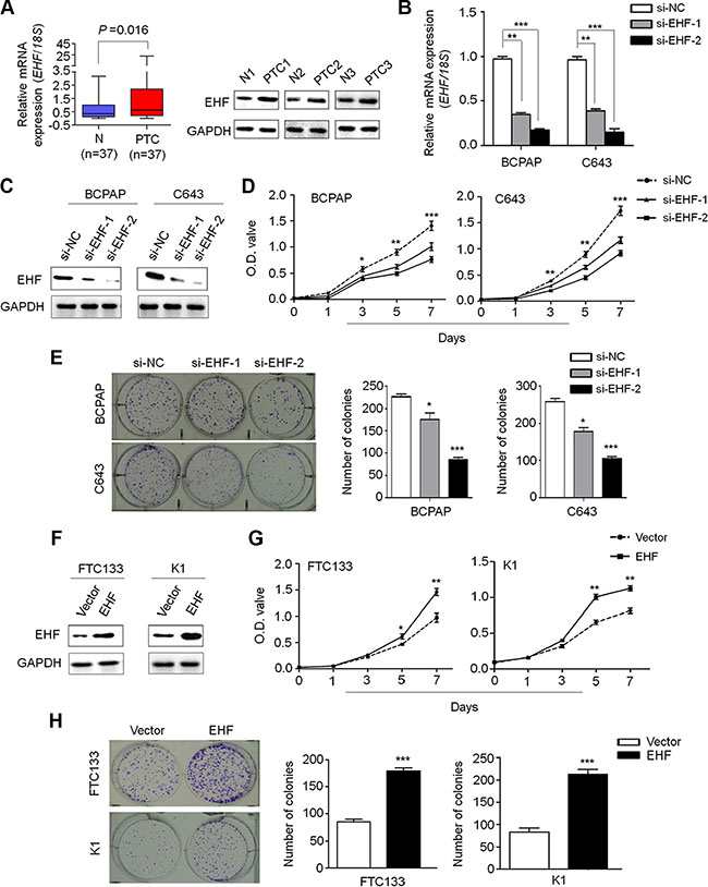 Figure 1: Increased expression of EHF promotes thyroid cancer cell proliferation and colony formation. qRT-PCR (A, left panel) and western blot (A, right panel) assays were performed to evaluate EHF expression in primary PTCs and their matched non-cancerous thyroid tissues (N). EHF expression was normalized with 18S rRNA levels. GAPDH was used as loading control in western blot assay. Knockdown of EHF mRNA (B) and protein (C) by using two different siRNAs (si-EHF-1 and si-EHF-2) in BCPAP and C643 cells was evidenced by qRT-PCR and western blot assays, respectively. 18S rRNA was used as a normalized control for qRT-PCR assay. GAPDH was used as loading control in western blot assay. The data were presented as mean ± SE. (D) EHF knockdown significantly inhibited thyroid cancer cell proliferation. The data were presented as mean ± SE. (E) EHF knockdown significantly inhibited colony formation of thyroid cancer cells. Left panel shows the representative images of colony formation in cells transfected with the indicated siRNAs. Quantitative analysis of colony numbers is shown in right panel. The data were presented as mean ± SE. (F) EHF expression levels were increased after transfection with EHF expression plasmid in FTC133 and K1 cells. Ectopic expression of EHF significantly enhanced cell proliferation (G) and colony formation (H) in these two cell lines. The data were presented as mean ± SE. Statistically significant differences were indicated: *P < 0.05; **P < 0.01; ***P < 0.001.