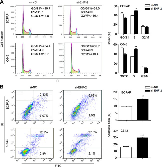 Figure 2: EHF knockdown induces cell cycle arrest and apoptosis in thyroid cancer cells. (A) BCPAP and C643 cells were transiently transfected with si-EHF-2 or si-NC. DNA content was measured by flow cytometry to determine cell cycle fractions. The fraction of cells in each cell cycle phase was indicated in the figures. (B) Apoptotic cells including early and late apoptotic cells were measured 48 h after transfection by flow cytometry analysis of Annexin V-FITC/PI double-labelled cells. The data were presented as mean ± SE of values from three independent experiments. Statistically significant differences were indicated: *P < 0.05; **P < 0.01; ***P < 0.001.