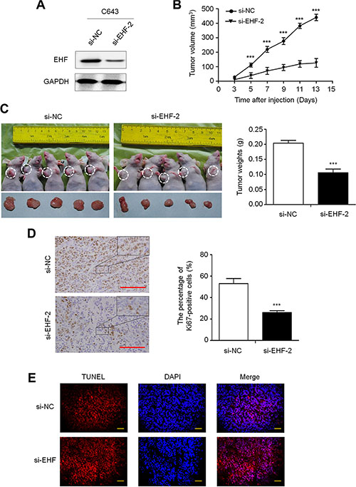 Figure 3: EHF knockdown inhibits the xenograft tumor growth. (A) Knockdown efficiency of EHF in C643 cells by si-EHF-2 transfection was demonstrated by western blot. (B) Subcutaneous tumor growth curve of si-EHF-2 transfected C643 cells in nude mice was compared with si-NC transfected cells. The si-EHF-2 group showed a retarded tumor growth compared to the si-NC group. Data are shown as mean ± SD (n =5/group). (C) A representative picture for tumor growth of cells transfected with the indicated siRNA in nude mice (left panel). Histogram represents mean of tumor weight from the si-EHF-2 and si-NC groups (right panel). Data are shown as mean ± SD (n = 5/group). (D) Shown is representative Ki-67 staining of xenograft tumors from the si-EHF-2 and si-NC groups (left panels). Histogram represents mean ± SE of the percentage of Ki-67-positive cells from 5 microscopic fields in each group (right panel). Scale bar, 200 μm. (E) The TUNEL (red) and DAPI (blue) staining in the xenograft tumors from si-EHF-2 and si-NC groups. Scale bar, 50 μm. Statistically significant differences were indicated: ***P < 0.001.