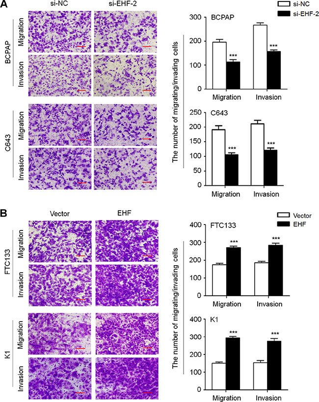 Figure 4: EHF knockdown inhibits thyroid cancer cell migration and invasion. (A) EHF knockdown suppressed cell migration and invasion in BCPAP and C643 cells. (B) Ectopic expression of EHF promoted cell migration and invasion in FTC133 and K1 cells. The representative images of migrated/invaded cells (left panels). Histograms, corresponding to upper panels, show means ± SE of cell numbers from three independent assays (right panels). Statistically significant differences were indicated: ***P < 0.001.