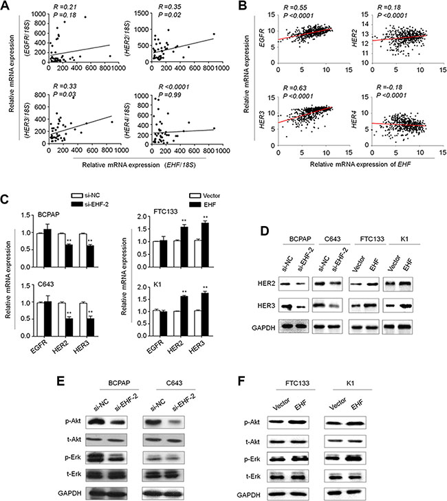 Figure 5: EHF regulates the expression of HER2 and HER3 and the activities of their downstream signaling pathways in thyroid cancer. The relationships between with mRNA expression of EHF and HER receptors (EGFR, HER2, HER3 and HER4) in primary PTCs from our cohort (A, n =37) and TCGA cohort (B, n = 513). (C) qRT-PCR assay was performed to investigate the effect of EHF knockdown on the expression of EGFR, HER2 and HER3. Expression levels of these genes were normalized with 18S rRNA levels. Data were presented as mean ± SE. (D) Western blot assay was used to confirm the effect of EHF knockdown or overexpression on the expression of HER2 and HER3. (E, F) The lysates from the indicated cells were subjected to western blot assays. The antibodies against phospho-Akt (p-Akt), total Akt (t-Akt), phospho-Erk (p-Erk) and total Erk (t-Erk) were used to determine the effect of EHF knockdown or overexpression on the activities of the PI3K/Akt and MAPK/Erk pathways. GAPDH was used as a loading control.