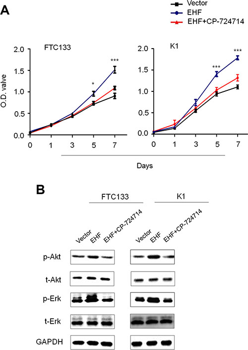 Figure 6: Tumor-promoting effect of EHF through activating HER2 signaling. (A) The effect of HER2 inhibition by CP-724714 on proliferation-promoting role of EHF in FTC133 and K1 cells was assessed by MTT assay. (B) Western blot assay was performed to evaluate the activities of two main downstream pathways of HER2, the PI3K/Akt and MAPK/Erk cascades, upon HER2 inhibition by CP-724714 in FTC133 and K1 cells. GAPDH was used as loading control in western blot assay. Statistically significant differences were indicated: *P < 0.05; ***P < 0.001.