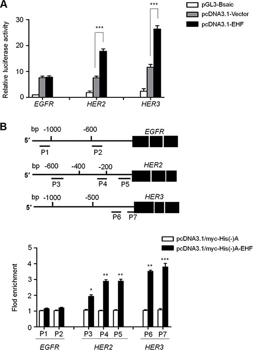 To further determine whether transcription factor EHF was indeed involved in directly regulating promoter activities of EGFR, HER2 and HER3, we cloned their promoters into a pGL3-Basic luciferase plasmid to construct luciferase reporter plasmids including pGL3-EGFR-Luc (−1051/+101), pGL3-HER2-Luc (−607/+11) and pGL3-HER3-Luc (−997/+440). As shown in Figure 7A, ectopic expression of EHF in FTC133 cells was able to significantly increase promoter activities of HER2 and HER3 (P < 0.001), but not EGFR. Next, we attempted to demonstrate whether EHF regulated the activities of HER2 and HER3 by directly binding to their promoters. Thus, the ChIP assay was performed in the EHF-transfected FTC133 cells and control cells, followed by qRT-PCR targeting their promoter regions. As shown in Figure 7B, EHF strongly bound to the prompter of HER2 and HER3 in FTC133 cells, but not EGFR. Three different fragments within HER2 promoter P3: –604/–484; P4: –274/–155; P5: –147/–37) and two different fragments with HER3 promoter (P6: –203/–81; P7: –77/+43) were enriched by 2.57- and 3.65-fold on average in pcDNA3.1/myc-His(−)A-EHF-transfected cells compared with vector-transfected cells, respectively. To be consistent with the dual luciferase findings, the ChIP assays further support HER2 and HER3 genes as potential targets of EHF in thyroid cancer.