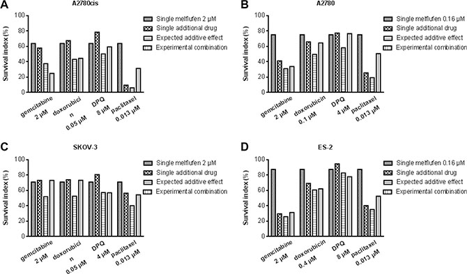 Figure 1: Melflufen combinations in different cell lines. Survival index of melflufen (2 μM) alone or in combination with gemcitabine (2 μM), doxorubicin (0.05 μM), DPQ (8 μM) or paclitaxel (0.013 μM) in A2780, A2780cis, SKOV-3, and ES-2 cell line. Mean of 3 replicates.
