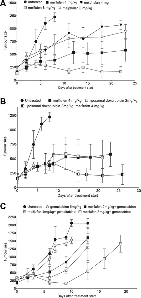 Figure 4: Intravenous melflufen in ovarian carcinoma xenograft alone or in combination with liposomal doxorubicin or gemcitabine. Intravenous melflufen inhibits growth of ovarian carcinoma xenograft alone or in combination with liposomal doxorubicin or gemcitabine. Data shown are all mice (n = 4–5) at each time point, regardless if sacrificed or not. (A) Mean ± SEM of tumor size at indicated times post treatment with melflufen or melphalan (4 or 8 mg/kg). (B) Mean ± SEM of tumor size at indicated times post treatment with melflufen (4 mg/kg), also shown in (A) or liposomal doxorubicin (2 mg/kg) or their combination. (C) Mean ± SEM of tumor size at indicated time post treatment with gemcitabine (5 mg/kg) or gemcitabine (5 mg/kg) + melflufen (2, 4 or 8 mg/kg).
