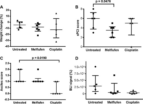 Figure 5: IP model: in vivo effects of melflufen and cisplatin in SK-OV-3 Luc IP1 xenografts. Weight change during treatment (A); sPCI score (B); Ascites score (C); BLI signal, reported as relative value compared to the BLI signal at day 0 (D). (A, B and C) were measured when euthanized. Bars indicating median and interquartile range (n = 5 to 6 animals in each group).