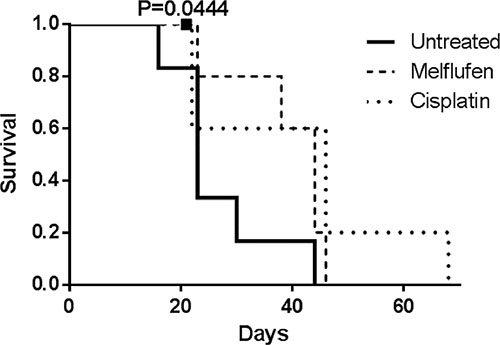 Figure 6: Kaplan-Meier survival curve of mice treated with melflufen and cisplatin. Mice treated with cisplatin and melflufen live longer than untreated mice, after IP injection of SK-OV3-Luc IP1 cells. Two mice (overlap) were censored because of death from non tumor-related causes and were indicated with a square (n = 5 to 6 animals in each group).