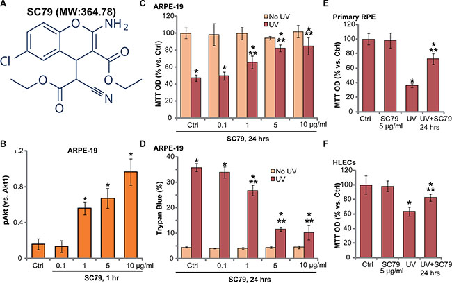 Figure 1: SC79 activates Akt and protects RPE cells from UV damages. The molecular structure along with the molecular weight (MW) of SC79 were presented (A). ARPE-19 cells were treated with applied concentration of SC79 (0.1–10 μg/mL, or 2.74–27.41 μM) for 1 h, p-Akt (Ser-473) and Akt1 expression was tested by Western blots and was quantified (B) n = 4). ARPE-19 cells (C and D) primary murine RPE cells (“Primary RPE”, (E)) or HLECs (F) pretreated with applied concentration of SC79 for 30 min, were subjected to UV radiation (30 mJ/cm2), cells were further cultured for 24 h, and cell viability was tested by MTT assay (C, E and F); Cell death was detected by trypan blue staining assay (D). “Ctrl” stands for untreated control group (Same for all figures). For each assay, n = 5. Experiments in this figure were repeated three times to insure consistency of results. *p < 0.05 vs. “Ctrl” group (C–F). **p < 0.05 vs. UV only group (C–F).