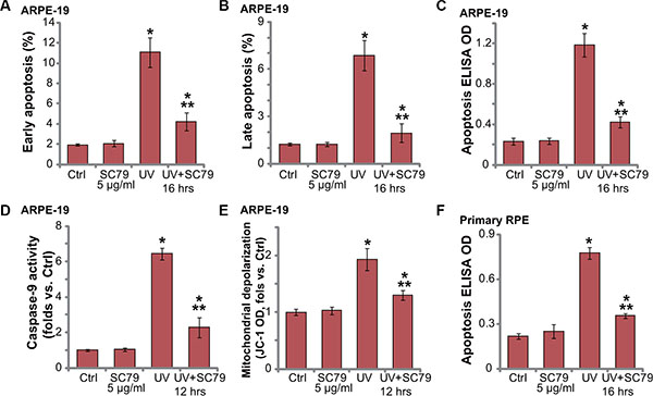 Figure 2: SC79 inhibits UV-induced apoptosis activation in RPE cells. ARPE-19 cells (A–E) or primary murine RPE cells (“Primary RPE”,(F)) were pretreated with SC79 (5 μg/mL) for 30 min prior to UV radiation (30 mJ/cm2), cells were further cultured for applied time, and cell apoptosis was tested by listed assays (A–F). For each assay, n = 5. Experiments in this figure were repeated three times to insure consistency of results. *p < 0.05 vs. “Ctrl” group. **p < 0.05 vs. UV only group.