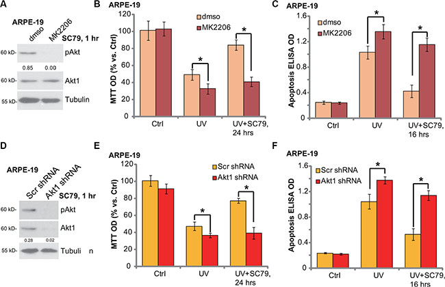 Figure 3: SC79-mediated RPE cytoprotection against UV requires Akt activation. ARPE-19 cells were pre-treated with MK-2206 (5 μM) for 1h, followed by SC79 (5 μg/mL) treatment for 1 h, p-Akt (Ser-473) and Akt1 expression was tested by Western blot assay (A). ARPE-19 cells were pre-treated with MK-2206 (5 μM) for 1 h, followed by UV radiation (30 mJ/cm2), or plus SC79 (5 μg/mL, 30 min prior UV), cells were further cultured for applied time; Cell viability ((B) MTT assay) and cell apoptosis ((C) Histone DNA ELISA assay) were tested. The stably ARPE-19 cells expressing scramble control shRNA (“Scr shRNA”) or Akt1 shRNA were treated with UV (30 mJ/cm2) radiation, or plus SC79 (5 μg/mL, 30 min prior UV); Cells were further cultured for applied time, cell viability (E) and cell apoptosis (F) were tested. SC79 (5 μg/mL, 1 h)-induced Akt activation in above cells was tested by Western blot assay (D). Akt phosphorylation (vs. regular Akt1) was quantified (A), Akt1 expression (vs. Tubulin) was quantified (D). “dmso” stands for 0.1% DMSO vehicle control (B and C). For each assay, n = 5. Experiments in this figure were repeated three times to insure consistency of results. *p < 0.05.