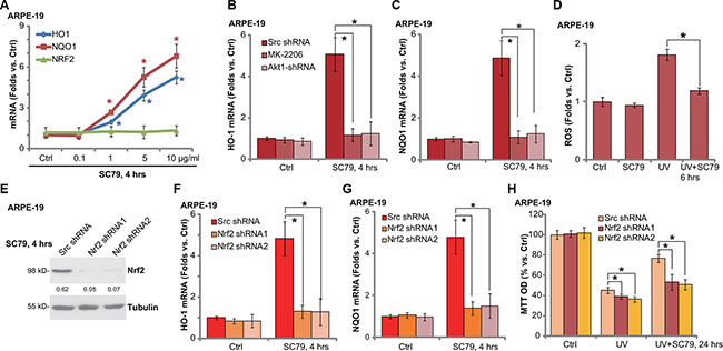 Figure 4: SC79 activates Nrf2 signaling in RPE cells. ARPE-19 cells were treated with applied concentration of SC79 (0.1–10 μg/mL) for 4 h, mRNA expression of HO-1, NQO-1 and Nrf2 was tested by RT-qPCR assay (A). Stably ARPE-19 cells with scramble-shRNA (“Scr shRNA”) or Akt1 shRNA were treated with SC79 (5 μg/mL) or plus MK-2206 (5 μM), HO-1 and NQO-1 mRNA expression was tested by RT-qPCR assay (B and C). ARPE-19 cells, pretreated with SC79 (5 μg/mL) for 30 min, were subjected to UV radiation (30 mJ/cm2), cells were further cultured and relative ROS production was tested (D). The stably ARPE-19 cells with scramble-shRNA (“Scr shRNA”) or Nrf2 shRNA (“−1/−2”, with non-overlapping sequences) were treated with SC79 (5 μg/mL) for indicated time, expressions of listed proteins and mRNA were tested by Western blot assay (E) and RT-qPCR assay (F and G) respectively. Above cells were treated with UV (30 mJ/cm2) radiation, or plus SC79 (5 μg/mL, 30 min prior UV), cells were further cultured for 24h and cell viability was evaluated by MTT assay (H). HO-1 protein expression (vs. Tubulin) was quantified (E). For each assay, n = 5. Experiments in this figure were repeated three times to insure consistency of results. *p < 0.05 vs. “Ctrl” group (A). *p < 0.05 (B, C, E and F).