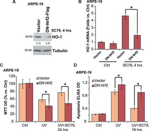 Figure 5: Nrf2 S40T mutation attenuates SC79-mediated RPE cytoprotection against UV radiation. Stable ARPE-19 cells expressing dominant negative Nrf2 (S40T, “DN-Nrf2”, flag tagged) or empty vector (pSV2 puro Flag) were treated with SC79 (5 μg/mL) for indicated time, expressions of listed protein and mRNA were tested by Western blot assay (A) and RT-qPCR assay (B) respectively. Above cells were also subjected to UV (30 mJ/cm2) radiation, or plus SC79 (5 μg/mL, 30 min prior UV), cell viability and apoptosis were tested MTT assay (C) and Histone DNA ELISA assay (D) respectively. HO-1 protein expression (vs. Tubulin) was quantified (A). For each assay, n = 5. Experiments in this figure were repeated three times to insure consistency of results. *p < 0.05.