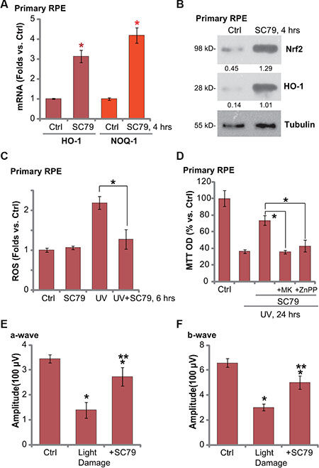 Figure 6: SC79 activates Nrf2 signaling in primary murine RPE cells and its retinal protection activity in vivo. Primary murine RPE cells were treated with SC79 (5 μg/mL) for indicated time, expressions of listed mRNAs (A) and proteins (B) were tested. Primary murine RPE cells were treated with UV (30 mJ/cm2) radiation, or plus SC79 (5 μg/mL, 30 min prior UV), cells were further cultured before ROS content was analyzed (C). Primary murine RPE cells were pre-treated with SC79 (5 μg/mL), or plus MK-2206 (“MK”, 5 μM)/ZnPP (10 μM), followed by UV (30 mJ/cm2) radiation, cells were further cultured for 24 h before cell viability was tested (D). After the light exposure in mice retina, ERG was measured, quantified amplitudes of a- and b-waves were presented (E and F). For each assay, n = 5. *p < 0.05 vs. “Ctrl” group (A, E and F). **p < 0.05 vs. “Light damage” only group (E and F). *p < 0.05 (C and D).