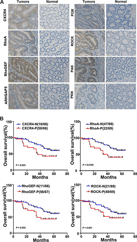Figure 2: CXCR4 and RhoA signaling pathway components are upregulated in colon cancer tissues and inversely correlate with the overall survival of colon cancer patients. (A) The relative levels of CXCR4 and the RhoA signaling pathway components RhoGEF, ARHGAP5, PI3K, ROCK, PAK, and PKN were assessed in colon cancer tissues and in paired normal colonic mucosa by immunohistochemical staining. Representative images are shown (200×). (B) Kaplan-Meier survival curves are shown for patients according to the expression of CXCR4, RhoA, RhoGEF, and ROCK in their colon cancer tissues. Colon cancer-associated death was significantly correlated with expression of CXCR4, RhoA, RhoGEF, and ROCK. Decreased patient overall survival was associated with higher expression of CXCR4 (upper left panel; n = 50/66; p = 0.023), RhoA (upper right panel; n = 47/69; p = 0.0192), RhoGEF (lower left panel; n = 56/67; p = 0.022), and ROCK (lower right panel; n = 48/69; p = 0.001). The red lines indicate patients with cancer tissues expressing CXCR4, RhoA, RhoGEF, and ROCK; blue lines indicate the patient tissues not expressing these proteins. In each graph, each ‘N’ implies negative expression, and each ‘P’ implies positive expression.