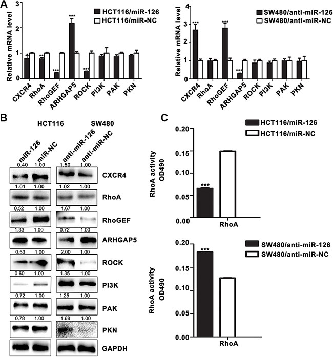 Figure 3: MiR-126 down-regulates the expression of CXCR4 and RhoA signaling pathway components in human colon cancer cells. (A) The mRNA levels of CXCR4 and components of the RhoA signaling pathway were determined by qRT-PCR in transfected HCT116 and SW480 cells. GAPDH expression served as the internal control.*p < 0.05; **p < 0.01; ***p < 0.001. (B) Western Blot for the detection of CXCR4 and components of the RhoA signaling pathway in transfected HCT116 and SW480 cells. GAPDH served as the internal control. (C) RhoA G-LISA activation assays were used to measure RhoA activity in the transfected cells. ***p < 0.001.