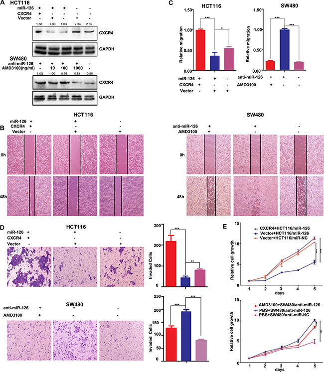 Figure 4: CXCR4 is a functional mediator for miR-126 in colon cancer cells. (A) Western Blots were used to confirm CXCR4 expression. Transient transfection of HCT116/miR-126 cells with CXCR4 plasmids resulted in increased expression of CXCR4 compared with that cells transfected with unmodified vectors or not transfected (upper panels). AMD3100 was used to inhibit CXCR4 expression in SW480/anti-miR-126 cells (bottom panels). At a concentration of 1000 ng/ml AMD3100, CXCR4 expression was substantially reduced. (B, C) Wound-healing assays were used to measure cell migration capacity. Migration increased following transient transfection with the CXCR4 plasmids (left panels), but the migration of SW480/anti-miR-126 cells was inhibited after exposure to AMD3100 (right panels) *p < 0.05, ***p < 0.001. (D) Transwell assays were used to measure cell invasion capacity. The invasion capacity of HCT116/miR-126 cells increased following transient transfection with the CXCR4 plasmids (top). The red, blue, and purple bars denote CXCR4 + HCT116/miR-126, vector + HCT116/miR-126, and vector + HCT116/miR-NC, respectively. The invasion capacity of SW480/anti-miR-126 cells was reduced after exposure to AMD3100 (bottom). The red, blue, and purple bars denote AMD3100 + SW480/anti-miR-126, PBS + SW480/anti-miR-126, and PBS + SW480/anti-miR-NC, respectively. Panels on the left show stained cells that had invaded. Cells in five randomly selected areas were counted, and a statistical analysis was performed using SPSS 17.0. (E) MTT assays were used to measure cell proliferation. The proliferation of HCT116/miR-126 cells was increased after transient transfection with the CXCR4 plasmids (top panel). The proliferation of SW480/anti-miR-126 cells was reduced after exposure to AMD3100 (bottom panel). The data represent the mean ± SD of three replicates **p < 0.01, ***p < 0.001.