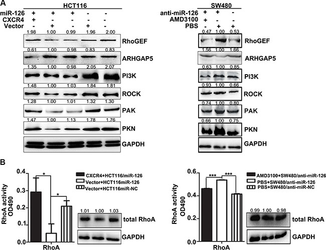 Figure 5: CXCR4 abolishes the effects of miR-126 on RhoA signaling pathway in colon cancer. (A) Western blot analysis of the expression levels of components of the RhoA signaling pathway. Left panels show expression levels in HCT116/miR-126 cells after transient transfection with the CXCR4 plasmids. Right panels show expression levels in SW480/anti-miR-126 cells after exposure to AMD3100 (1000 ng/ml). (B) RhoA activation G-LISA assays were used to measure RhoA activity in HCT116/miR-126 cells transiently transfected with the CXCR4 plasmids (left panels) and in SW480/anti-miR-126 cells exposed to 1000 ng/ml AMD3100 (right panels). *p < 0.05, ***p < 0.001.