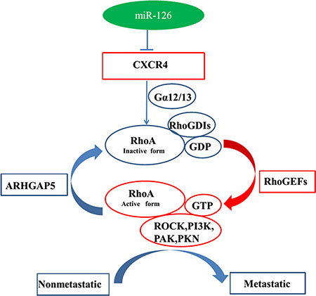 Liu et al. [35] found that miR-126 functions as a tumor suppressor in colorectal cancer cells by targeting CXCR4 via the AKT and ERK1/2 signaling pathways. In the present study, we discovered the novel regulation pathway of miR-126, which for the first time validated the mechanism of miR-126 acts as tumor suppressor, via regulation of the CXCR4 and RhoA signaling pathway both in vitro and in vivo (Figure 7). These data extended the regulation network of miR-126 and membrane receptor CXCR4 which provide a rationale for future application of miR-126/CXCR4/RhoA based diagnostic marker and targeted therapy.