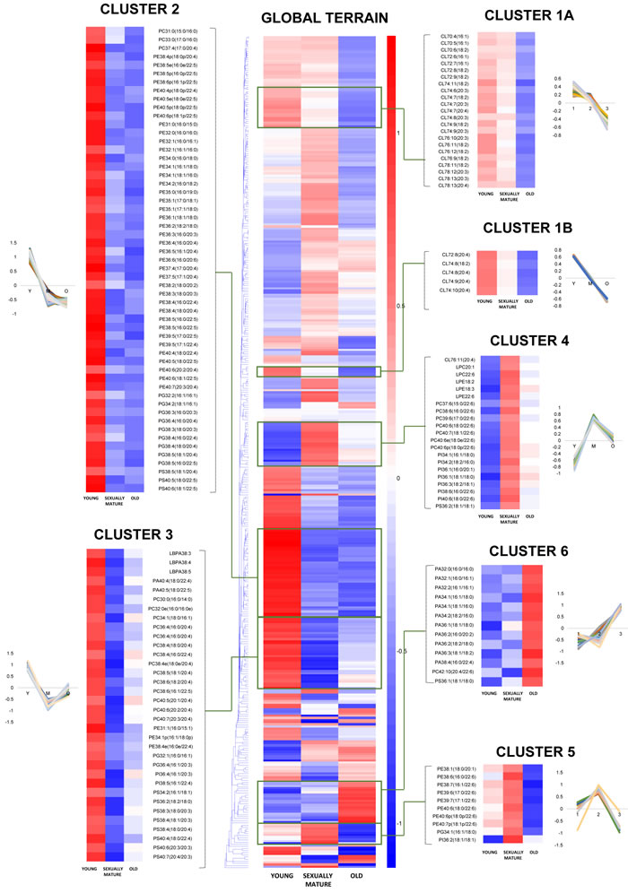 Figure 2: Euclidean clustering of 391 individual phospholipid species detected in the frontal cortex of young, sexually-mature and old monkeys using fatty acid-specific transitions. Seven individual clusters with notably distinct patterns of changes across the three age groups were magnified using the same scale as the global terrain map. The mean of z-scores was plotted for each biological group examined.