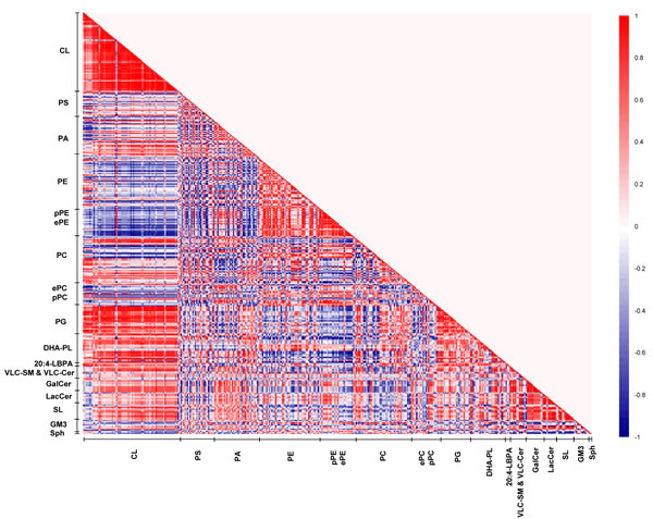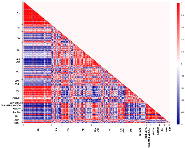 Figure 5: Lipid correlation matrix constructed based on the membrane lipidome of young macaques comprising a selected pool of 386 individual membrane lipid species. Vertical axis indicates magnitudes of correlation coefficients (r).