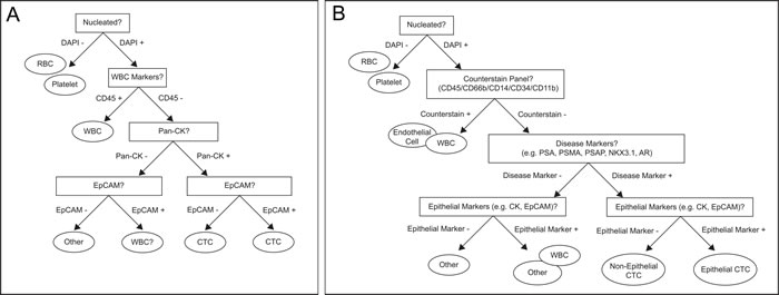 CTC technologies uniformly use biomarkers for the identification and enumeration of candidate CTCs. In the framework of the CellSearch system, the consensus biomarker set for defining a cell as a true CTC relies on nuclear, epithelial, and hematopoietic markers. To help visualize the biomarker criteria for defining a cell as a CTC under the CellSearch paradigm, we have produced a decision tree (Figure 4A).