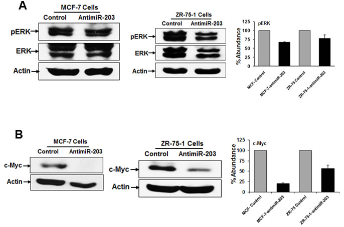 Figure 3: ERK-c-myc signaling pathways are inhibited by anti-miR-203 in breast cancer cells. MCF-7 control, MCF-7-antimiR-203, ZR-75-1 control and ZR-75-1-antimiR-203 cells lysates were analyzed for pERK, ERK (A) and c-Myc (B) expression by Western blot analysis. The blots were reprobed with an antibody to actin for comparison of protein loading in each lane. Densitometry analyses of all these proteins were done by using Image J software and shown on the right. Data are represented as mean ± SD.