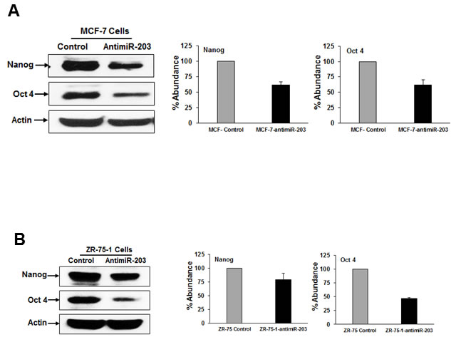 Figure 6: Inhibition of miR-203 reduces the expression of stemness makers. A. MCF-7 and MCF-7-antimiR-203 B. ZR-75-1 and ZR-75-1-antimiR-203 cell lysates were subjected to Western blot analyzing using Nanog and Oct 4 antibodies. These blots were reprobed with an antibody to actin for comparison of protein loading in each lane. Densitometric analyses of these proteins were done by using Image J software and shown on the right. Data are represented as mean ± SD.