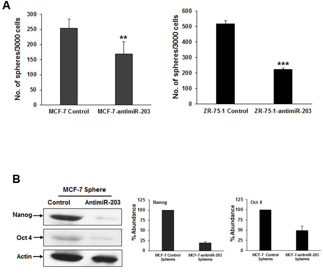 Figure 7: Inhibition of miR-203 reduces mammosphere formation and the expression of Nanog and Oct4. A. Equal number of MCF-7-control, MCF-7-antimiR-203, ZR-75-1-control and ZR-75-1-antimiR-203 cells were seeded in ultra-low attachment plates and incubated for 10 days. The number of spheres (>70 mm) were counted. The results are presented as means of three different experiments with standard deviations (**p < 0.01, ***p < 0.001). B. Mammospheres lysates from MCF-7-control and MCF-7-antimiR-203 cells were analyzed for expression of Nanog and Oct 4 using specific antibodies. These blots were reprobed with an antibody to actin for comparison of protein loading in each lane. Densitometric analyses of these proteins were done by using Image J software and shown on the right. Data are represented as mean ± SD.