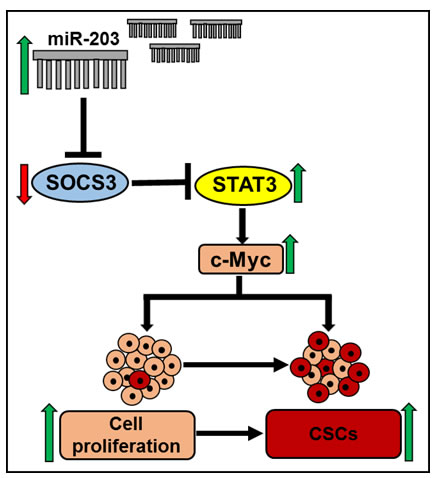Figure 8: Schematic diagram of proposed mechanism. miR-203 expression may regulate breast cancer cells proliferation and stemness by inhibiting the expression of SOCS3 and enhancing expression of Stat3 and c-Myc.