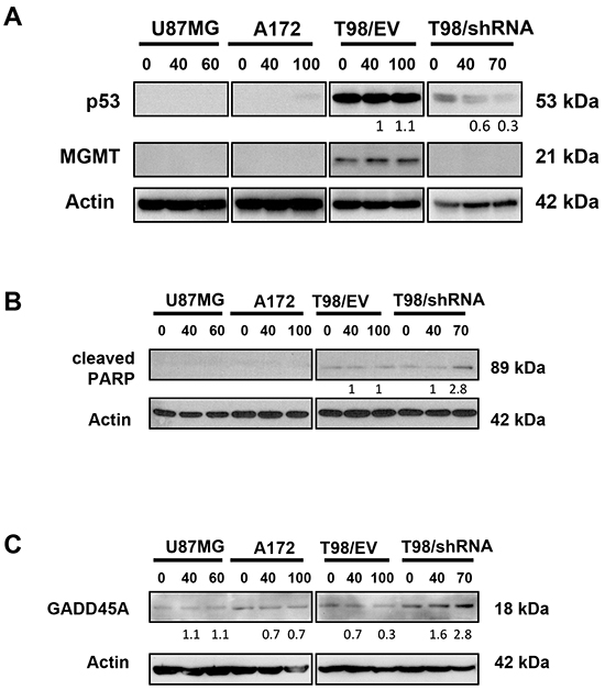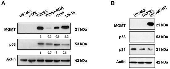 Figure 1: MGMT silencing decreased mutp53 protein levels in mutp53 GBM cell lines isogenic for MGMT. A. Western blotting analysis of the effect of MGMT silencing on expression of p53. Expression of MGMT and p53 in lysates of U87MG, A172, T98G transfected with empty vector control (T98/EV) and shRNA-mediated knockdown of endogenous MGMT (T98/shRNA), as well as U138 and LN-18 GBM cell lines. B. Western blotting analysis of expression of MGMT, p53 and p21 in U87MG, U87/EV and U87/MGMT. Actin was used as a loading control. The density of MGMT and p53 bands was normalized to that of T98/EV.