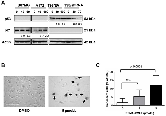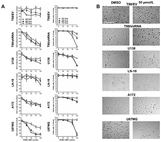 Figure 2: PRIMA-1MET reduced relative cell number of GBM cell lines irrespective of p53 status. A. Analysis of the cytotoxic effect of PRIMA-1MET on T98/EV, T98/shRNA, U138, LN-18, A172 and U87MG GBM cell lines using trypan blue exclusion assay and automated cell counting to determine the percentage of relative number of cells in PRIMA-1MET-treated conditions relative to DMSO control at each time point (24, 48 or 72 hours following initiation of a 24-hour treatment with PRIMA-1MET) (left) and the ratio of viable cells (% relative to total cell number in each experimental condition) (right) in the indicated cell lines. Data on graphs represent the mean values ± SD and are representative of at least three independent experiments. B. Representative micrographs of GBM cells (original magnification 100X) treated with PRIMA-1MET (50 μM, 24 hours) or DMSO control. Scale bar = 250 μm.