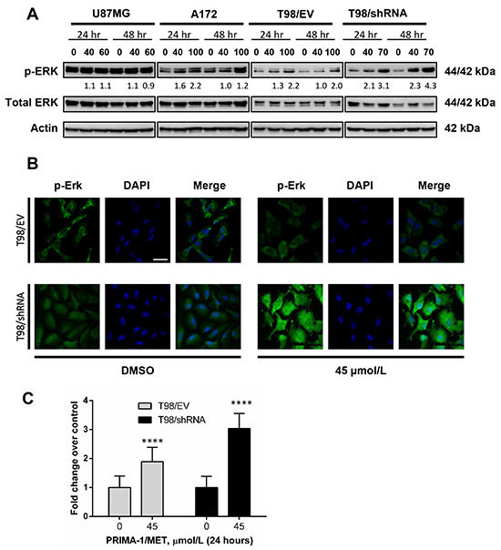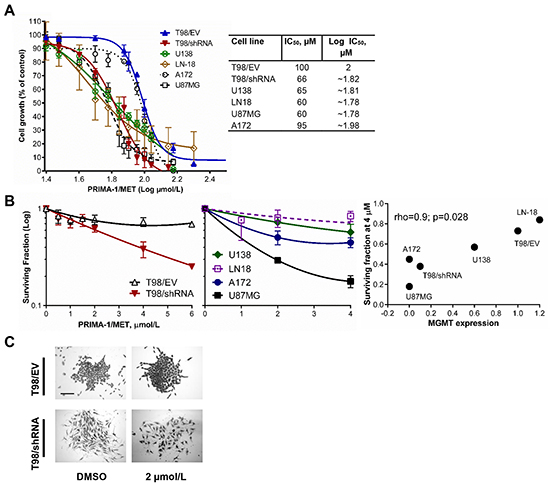 We used PRIMA-1MET to test the functional consequences of down-regulation of MGMT expression levels in our MGMT isogenic cell lines with GOF mutp53 background. We assessed cytotoxic effects of PRIMA-1MET (24-hour treatment) in GBM cell lines based on MGMT expression and TP53 status. First, to test the viability of GBM cell lines in vitro we treated T98/EV, T98/shRNA, U138, LN-18, U87MG and A172 cell lines with 25, 50, 75 or 100 μM PRIMA-1MET for 24 hours, then cells were kept in drug-free medium for 24 hours (48-hour time point) or 48 hours (72-hour time point). We examined the relative cell number (percentage relative to DMSO control) and viable cell number (% relative to total cell number in each experimental condition) at each time point (24, 48 or 72 hours) using trypan blue exclusion assay and automated cell counting.
