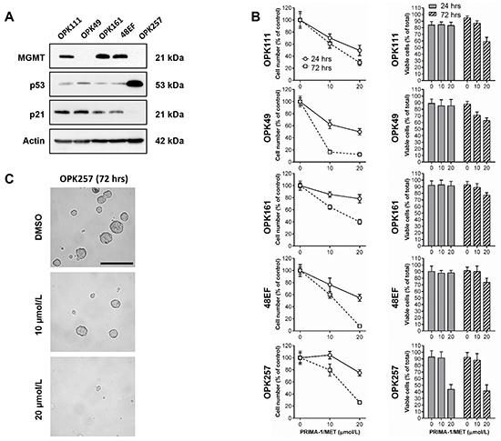 Table 2: Relative cell number and viable cells (%) in GBM cell lines treated with a range of PRIMA-1MET doses